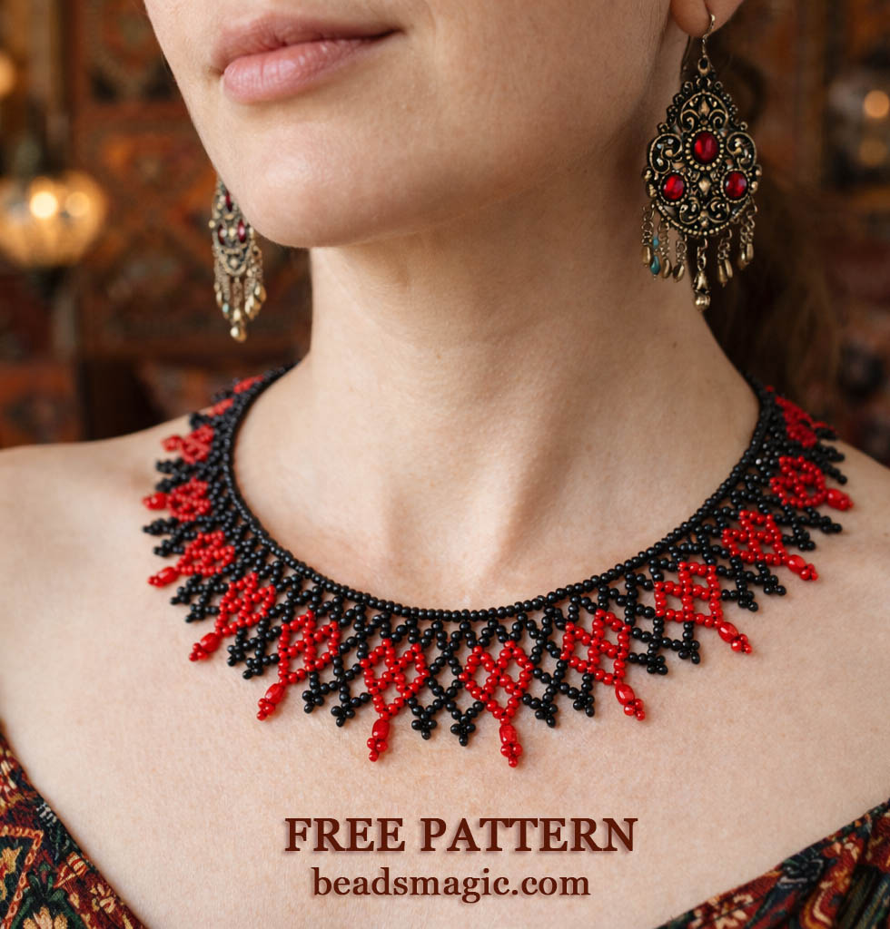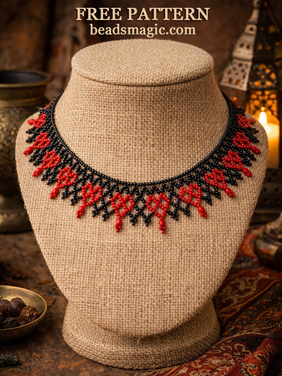 This design is inspired by small heart-shaped motifs and soft, flowing lines that come together in a delicate yet expressive piece. The pattern is suitable for confident beginners and more experienced beaders. You can easily personalize the necklace by changing colors, bead finishes, or length to create your own unique version.